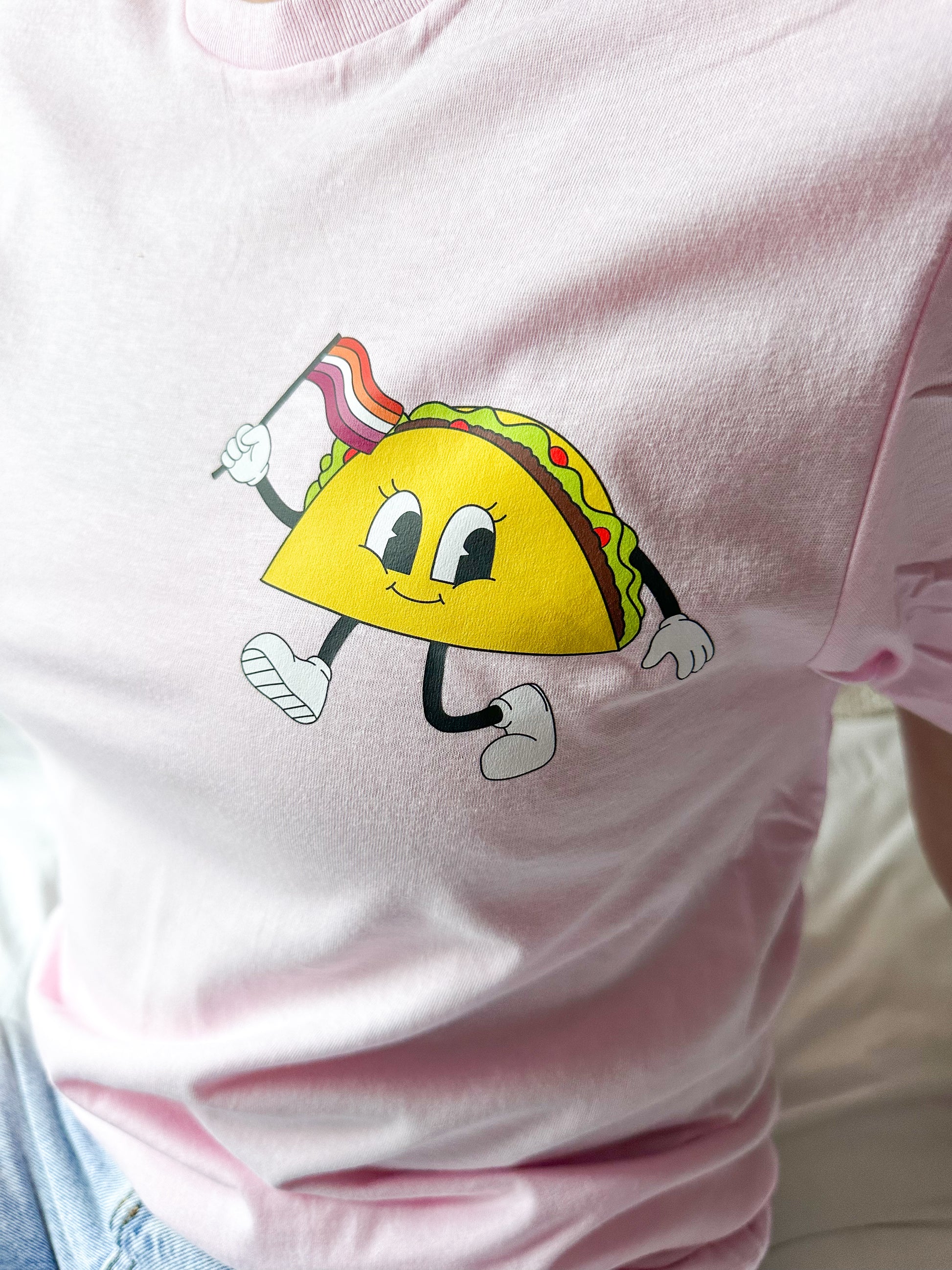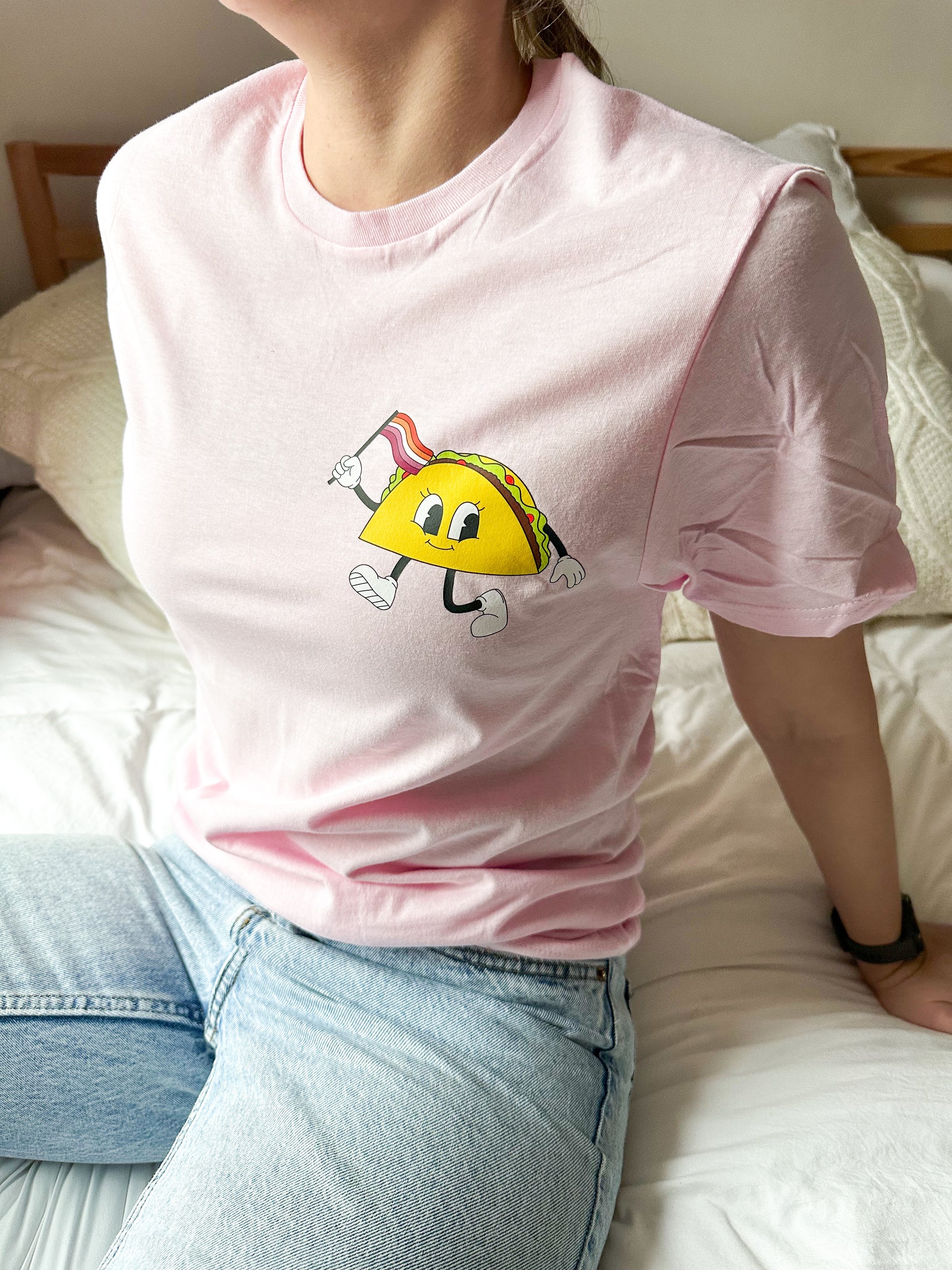 Celebrate pride with a playful twist! This unisex t-shirt features a charming vintage cartoon taco proudly waving the lesbian flag. Perfect for those who love quirky, fun fashion that makes a statement. Soft, comfortable, and designed for everyone—wear your pride with a smile and a side of humor.